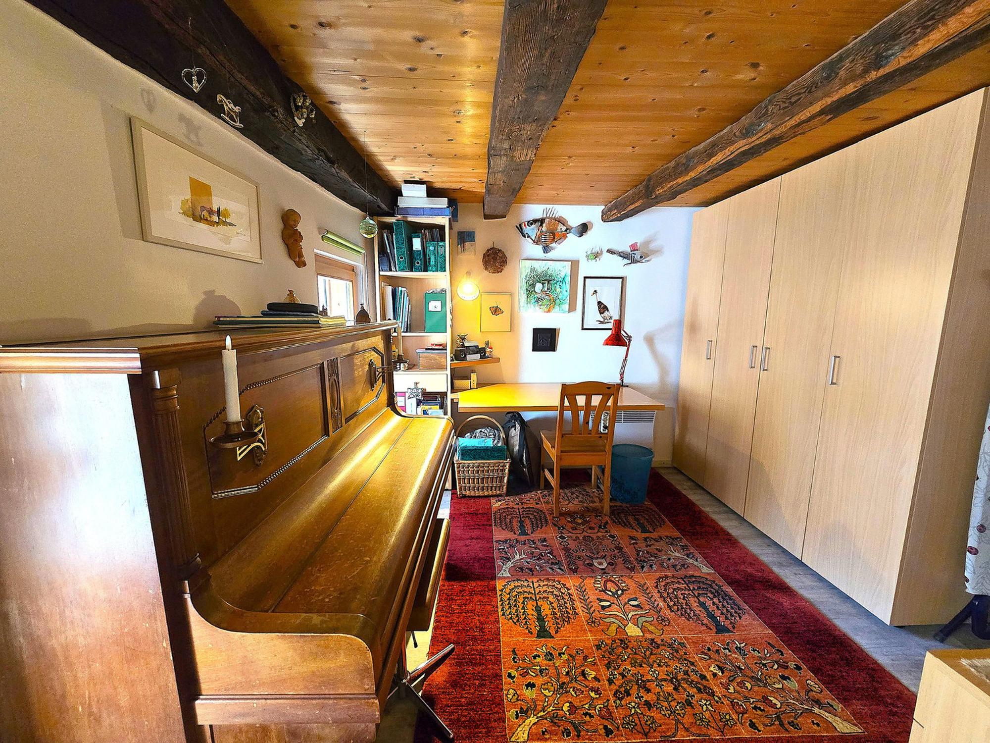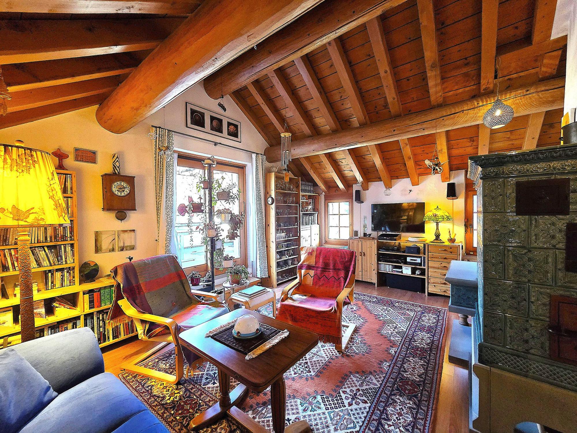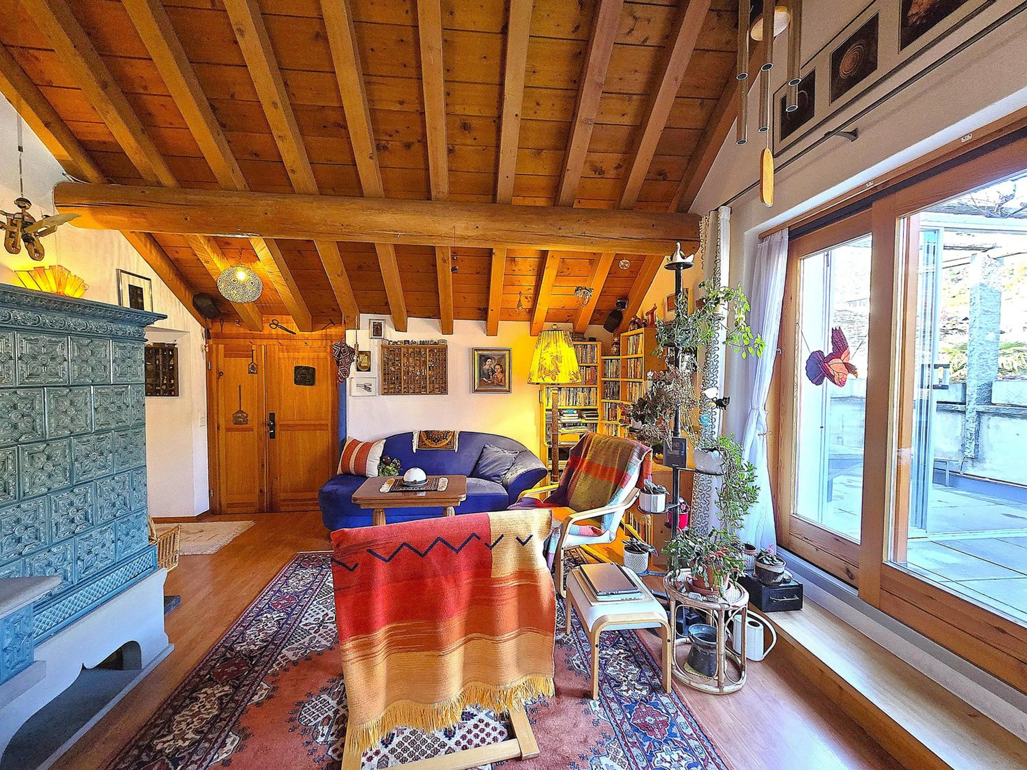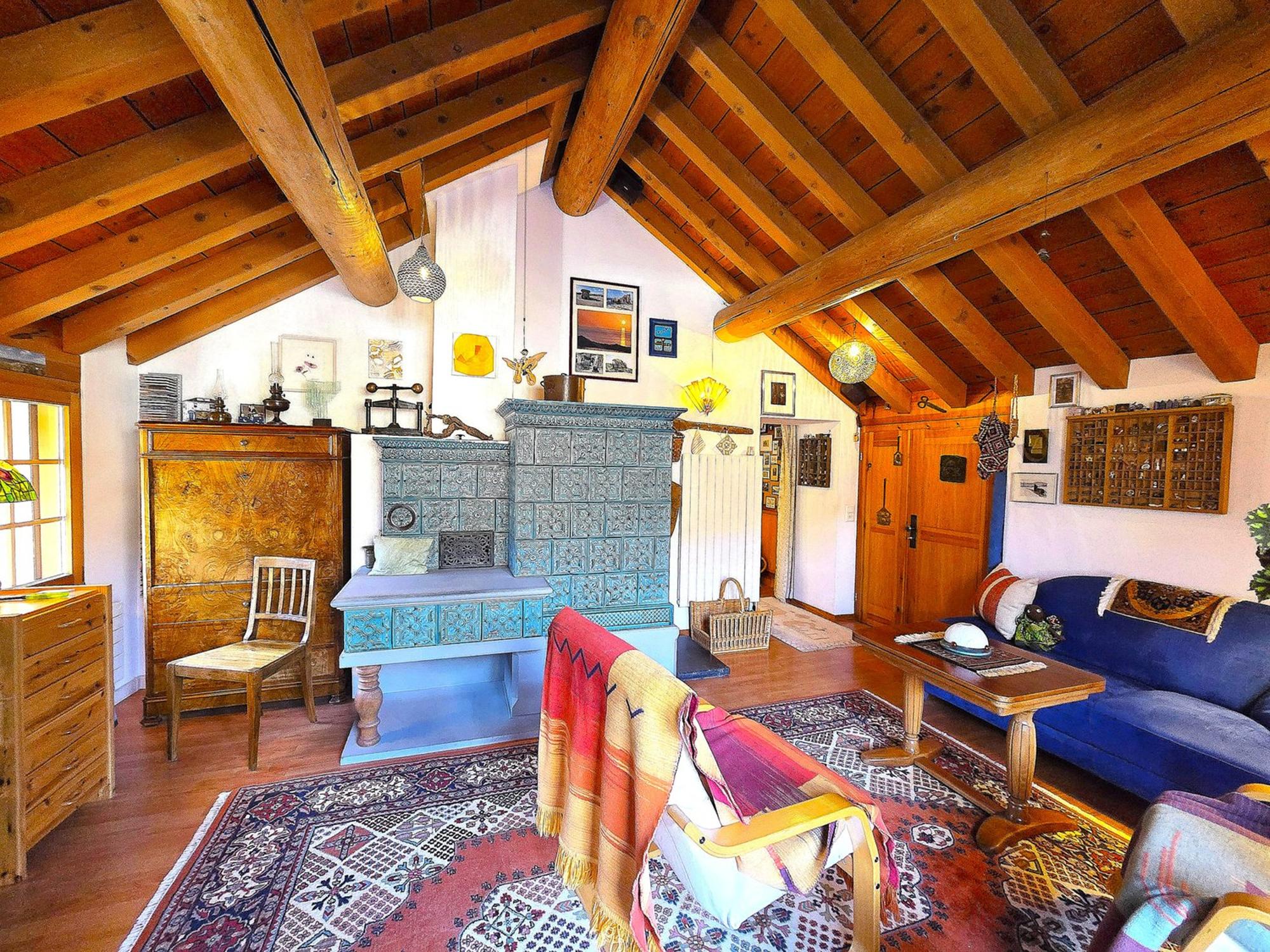 Im ersten Stock finden wir ein gemütliches Wohnzimmer mit einem schönen Keramikofen und Zugang zur Terrasse, ein Doppelzimmer und ein Badezimmer/Dusche/WC.