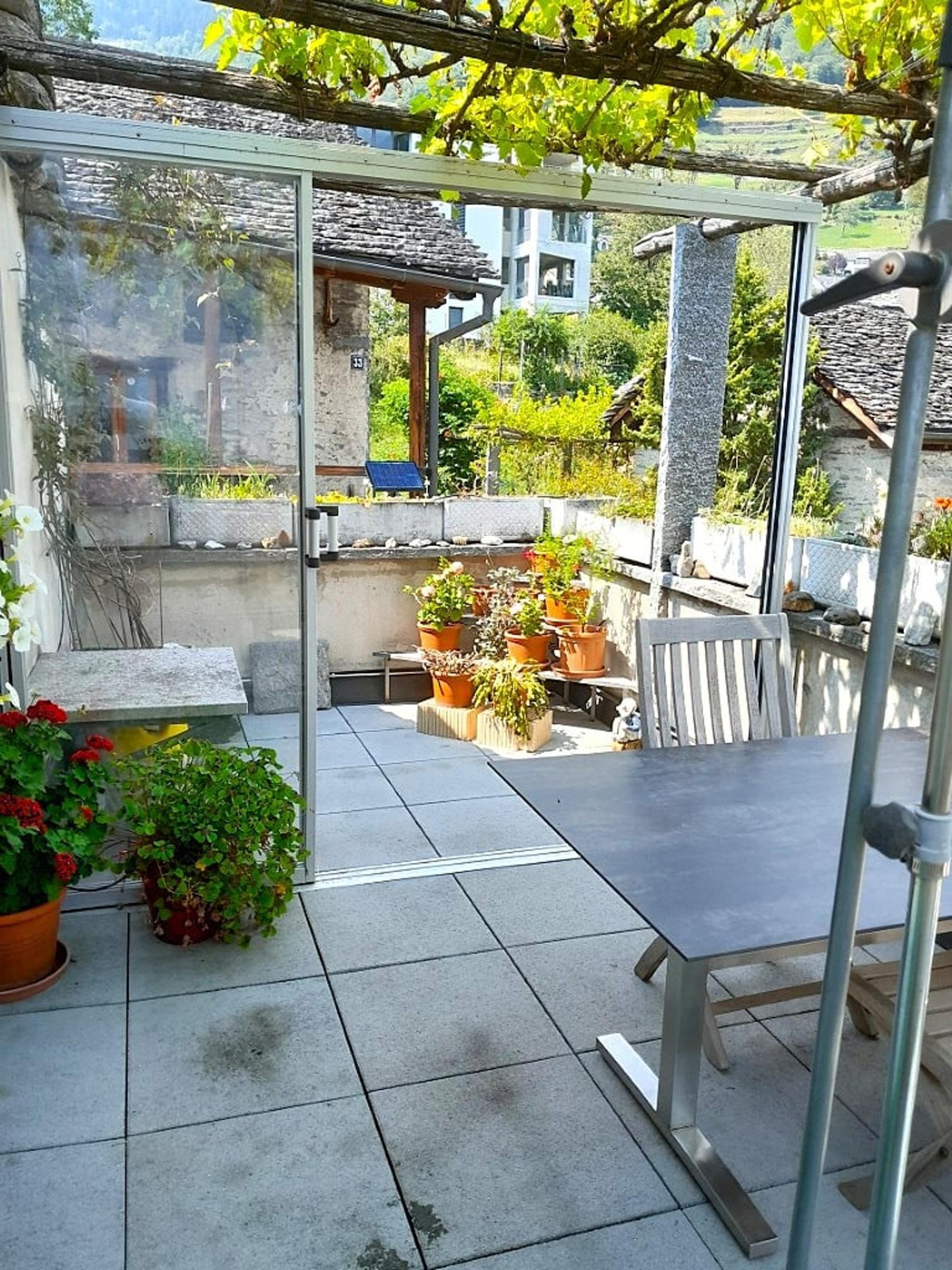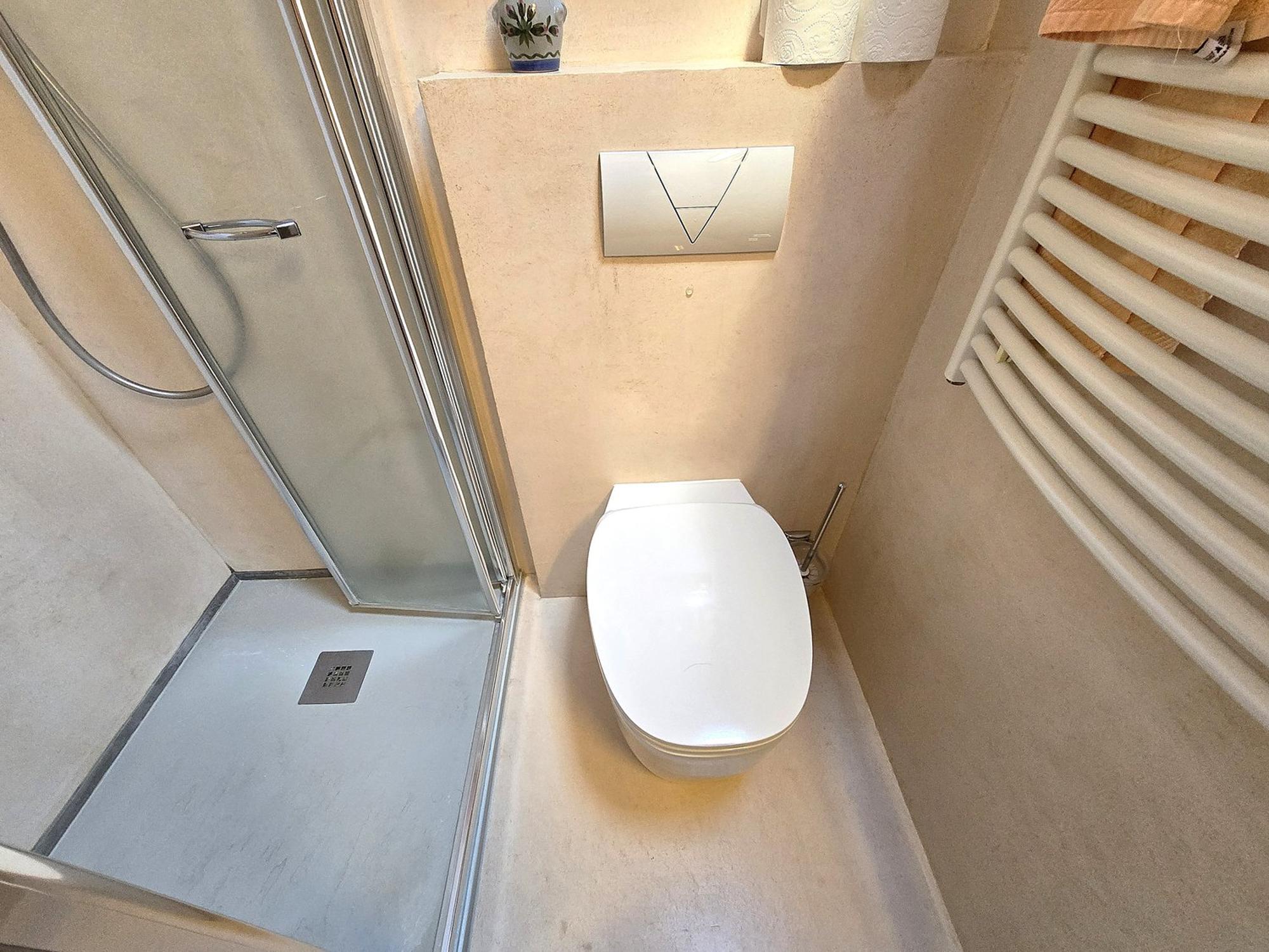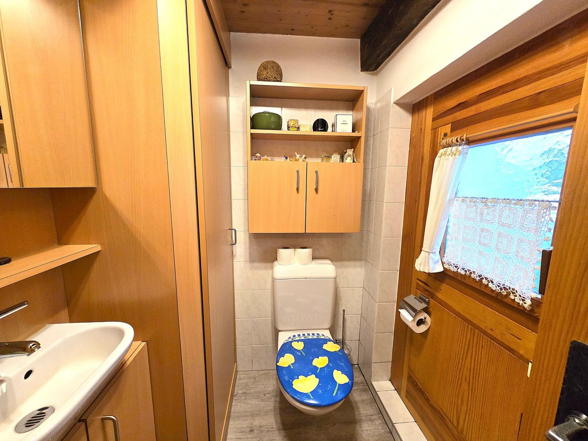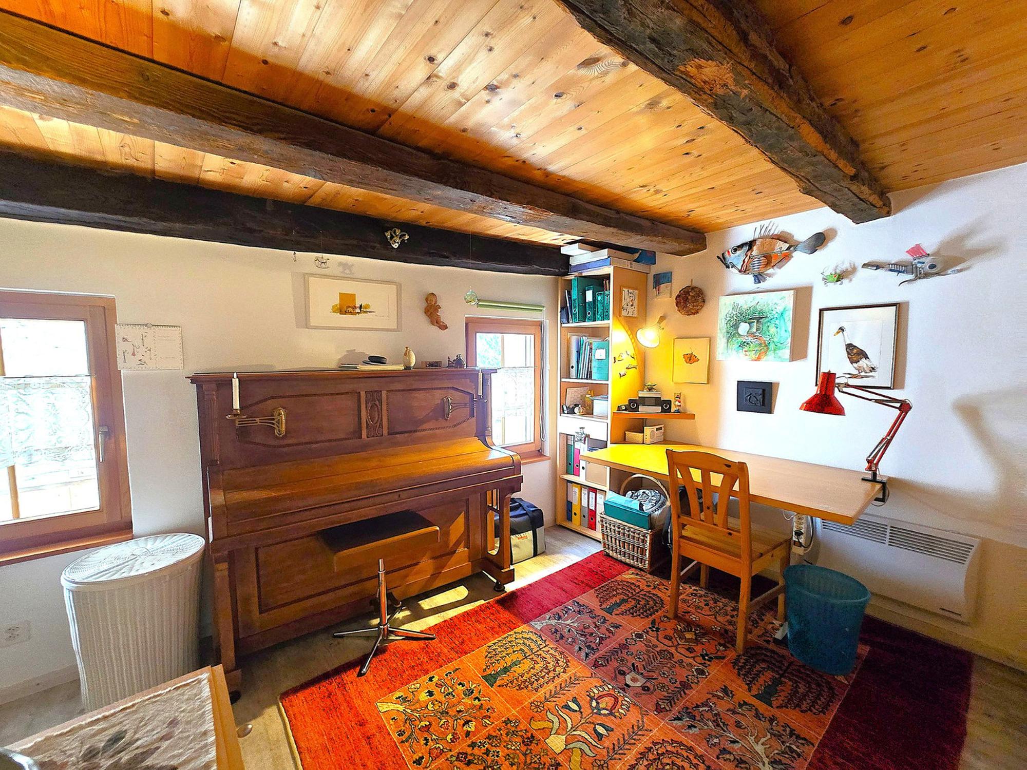 Im ersten Stock finden wir ein gemütliches Wohnzimmer mit einem schönen Keramikofen und Zugang zur Terrasse, ein Doppelzimmer und ein Badezimmer/Dusche/WC.