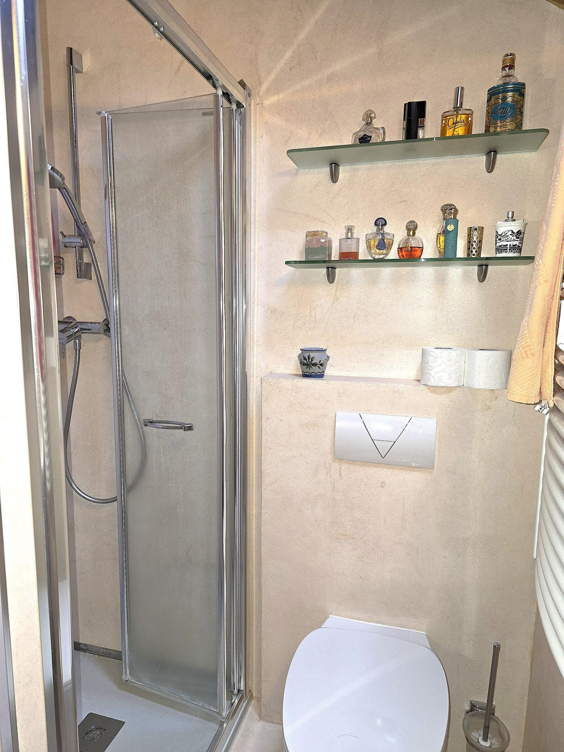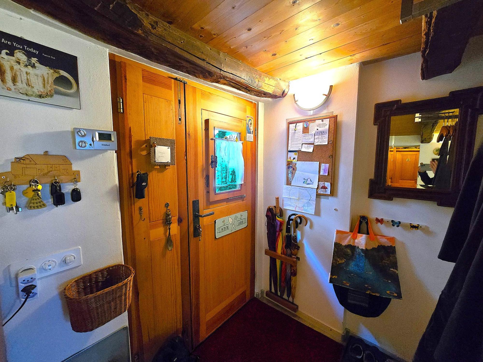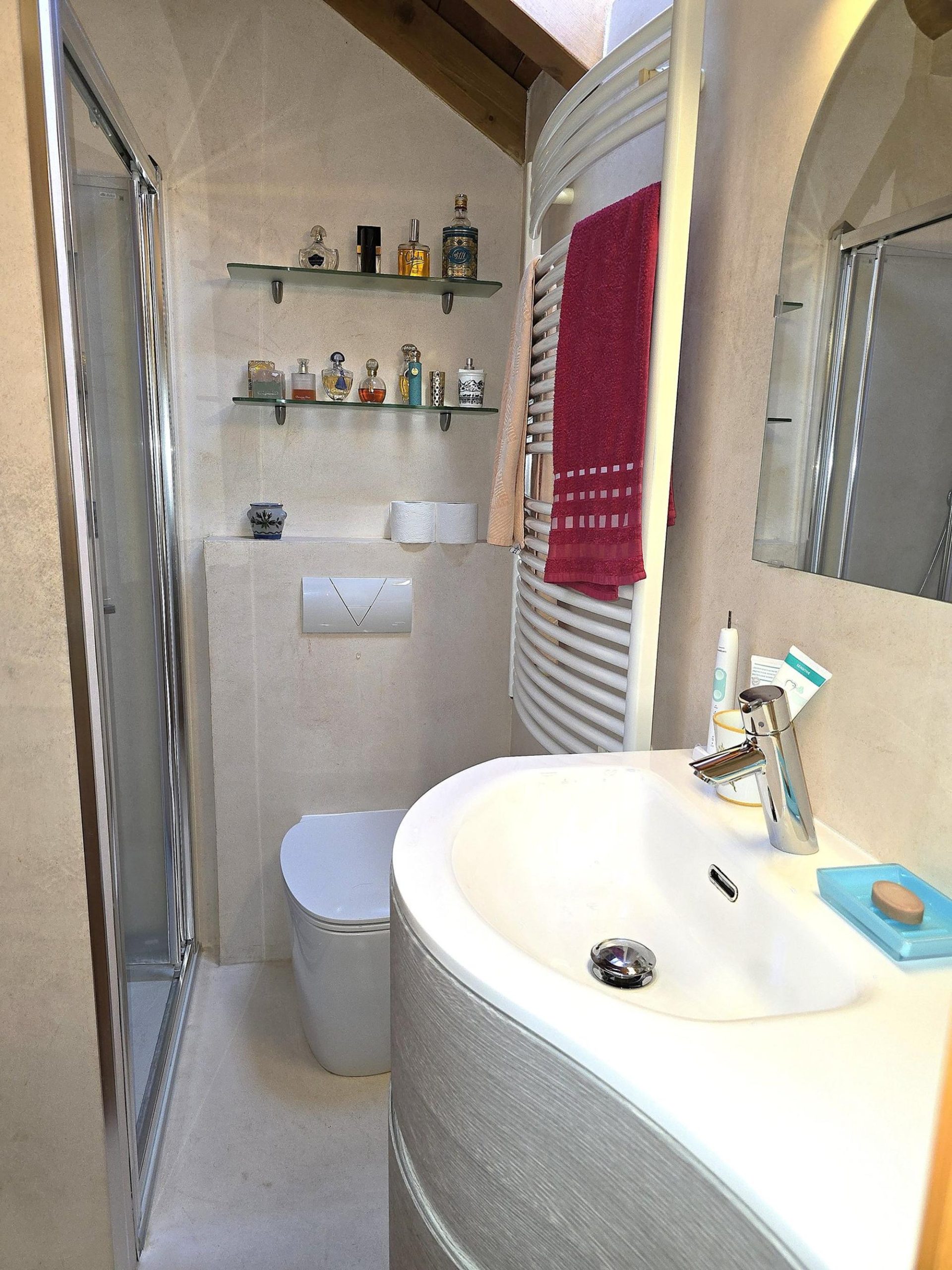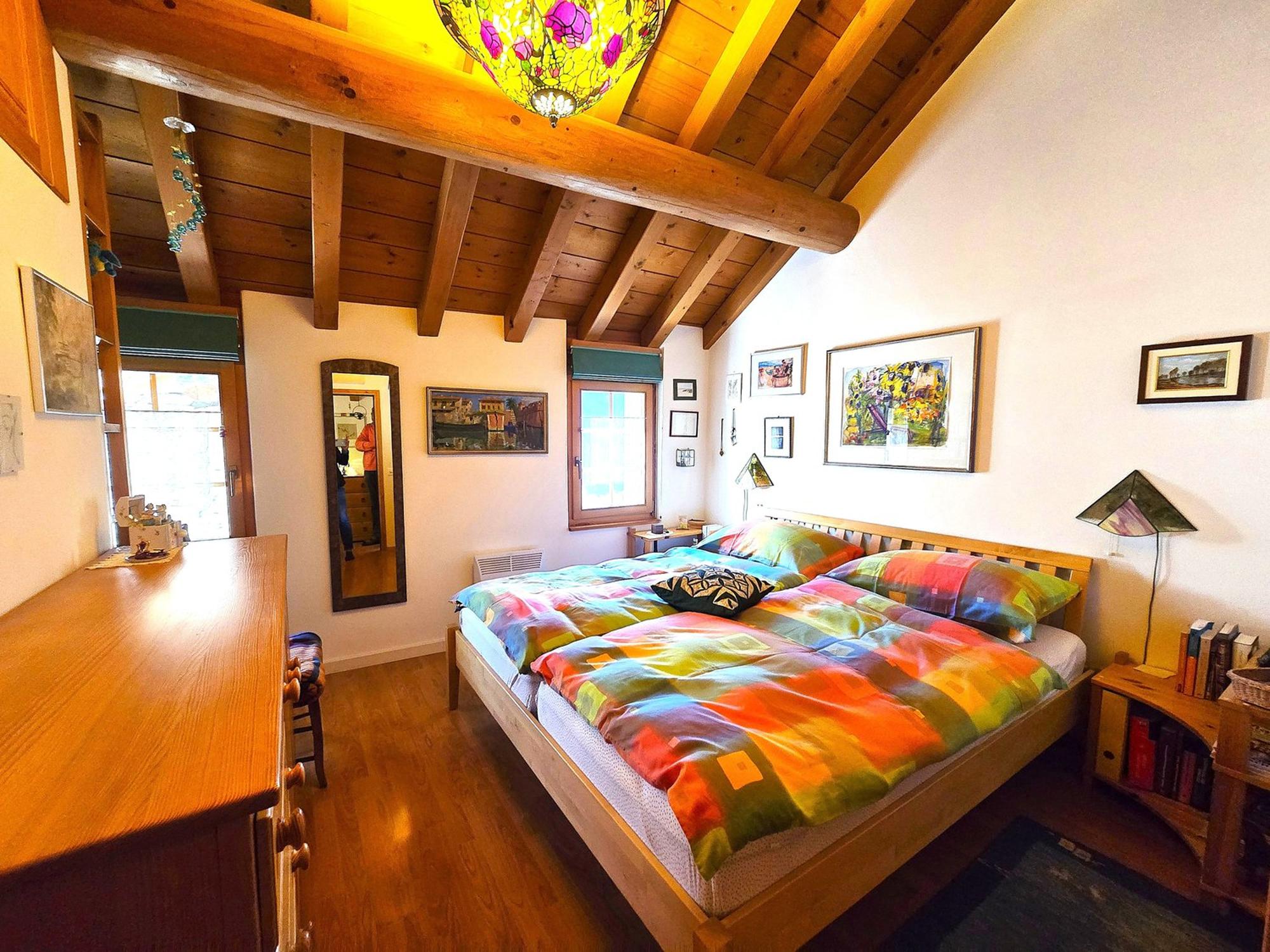 Im ersten Stock finden wir ein gemütliches Wohnzimmer mit einem schönen Keramikofen und Zugang zur Terrasse, ein Doppelzimmer und ein Badezimmer/Dusche/WC.