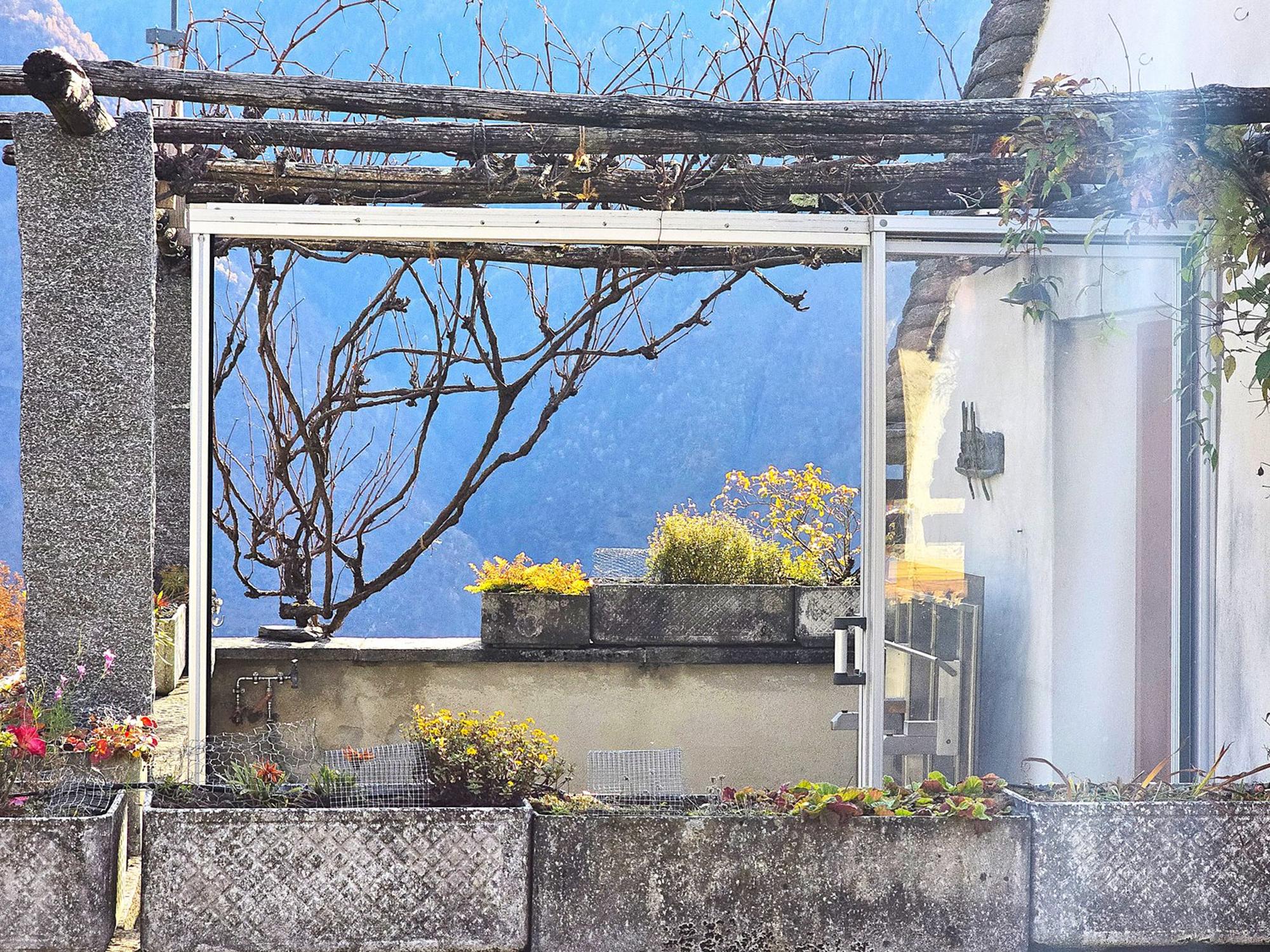 La terrazza con pergola di uva americana e vista panoramica è un vero sollievo nelle giornate calde.