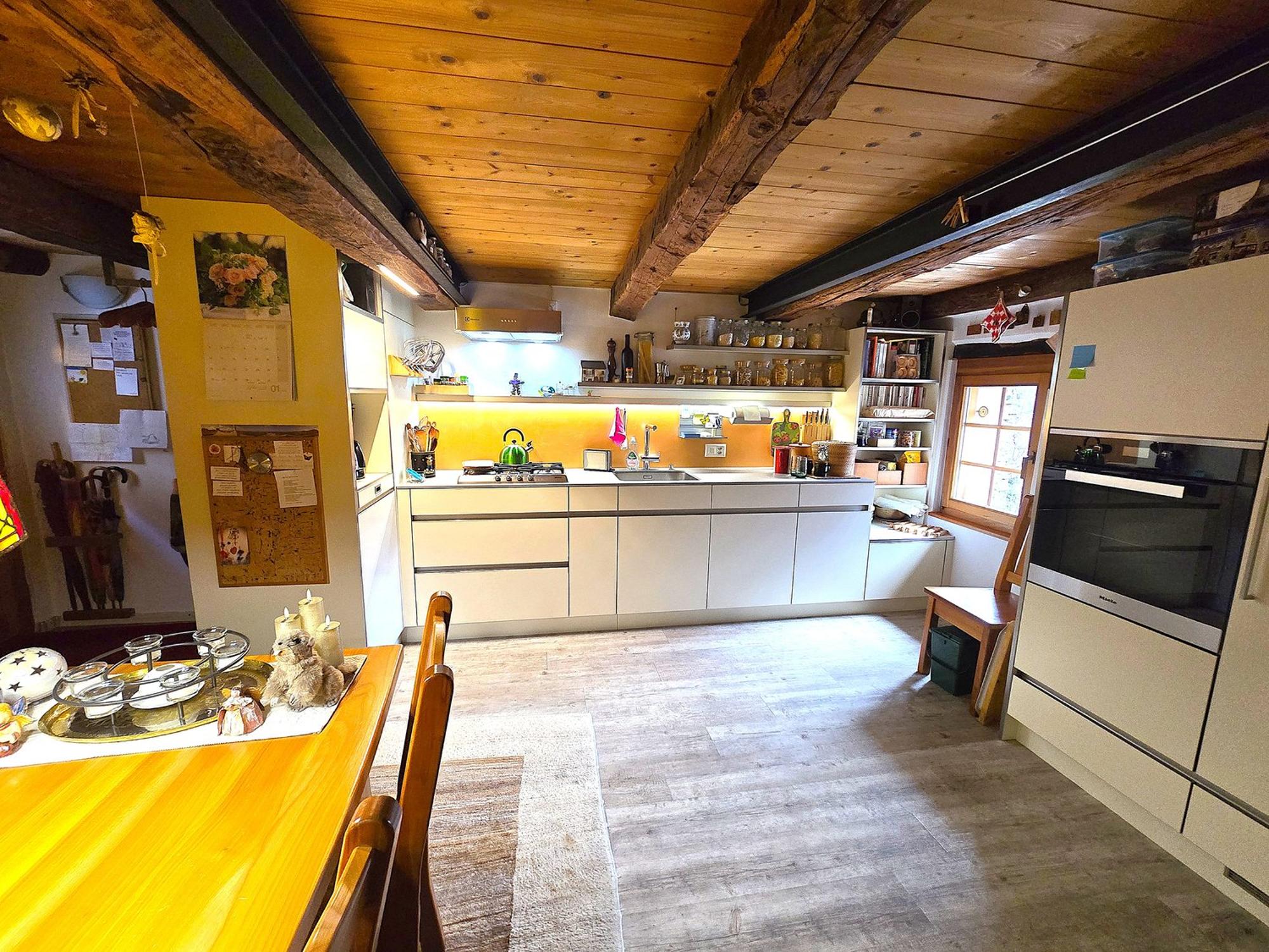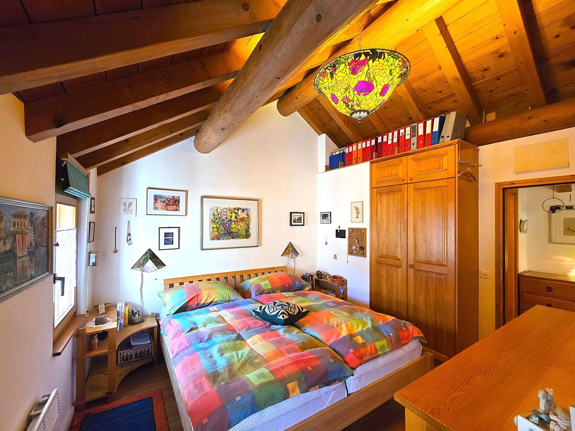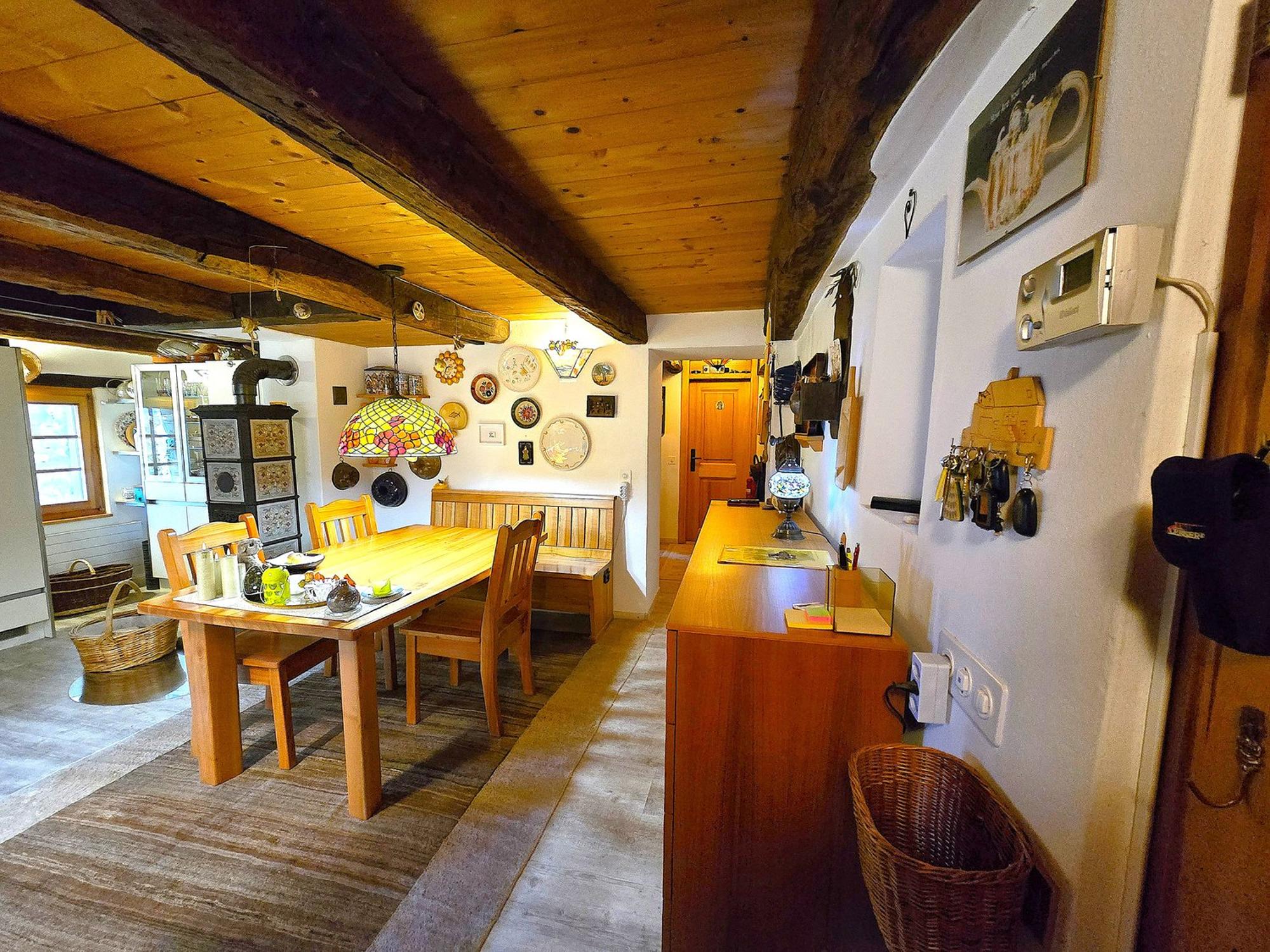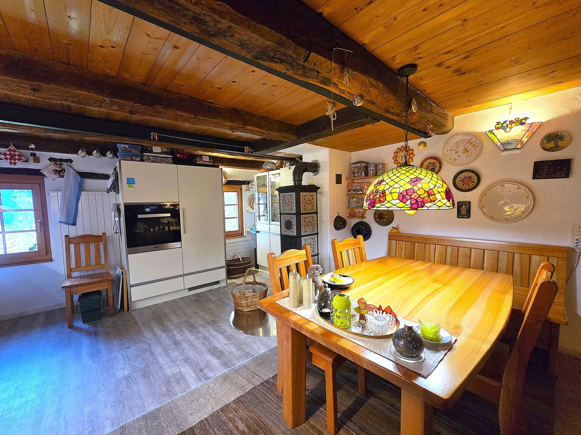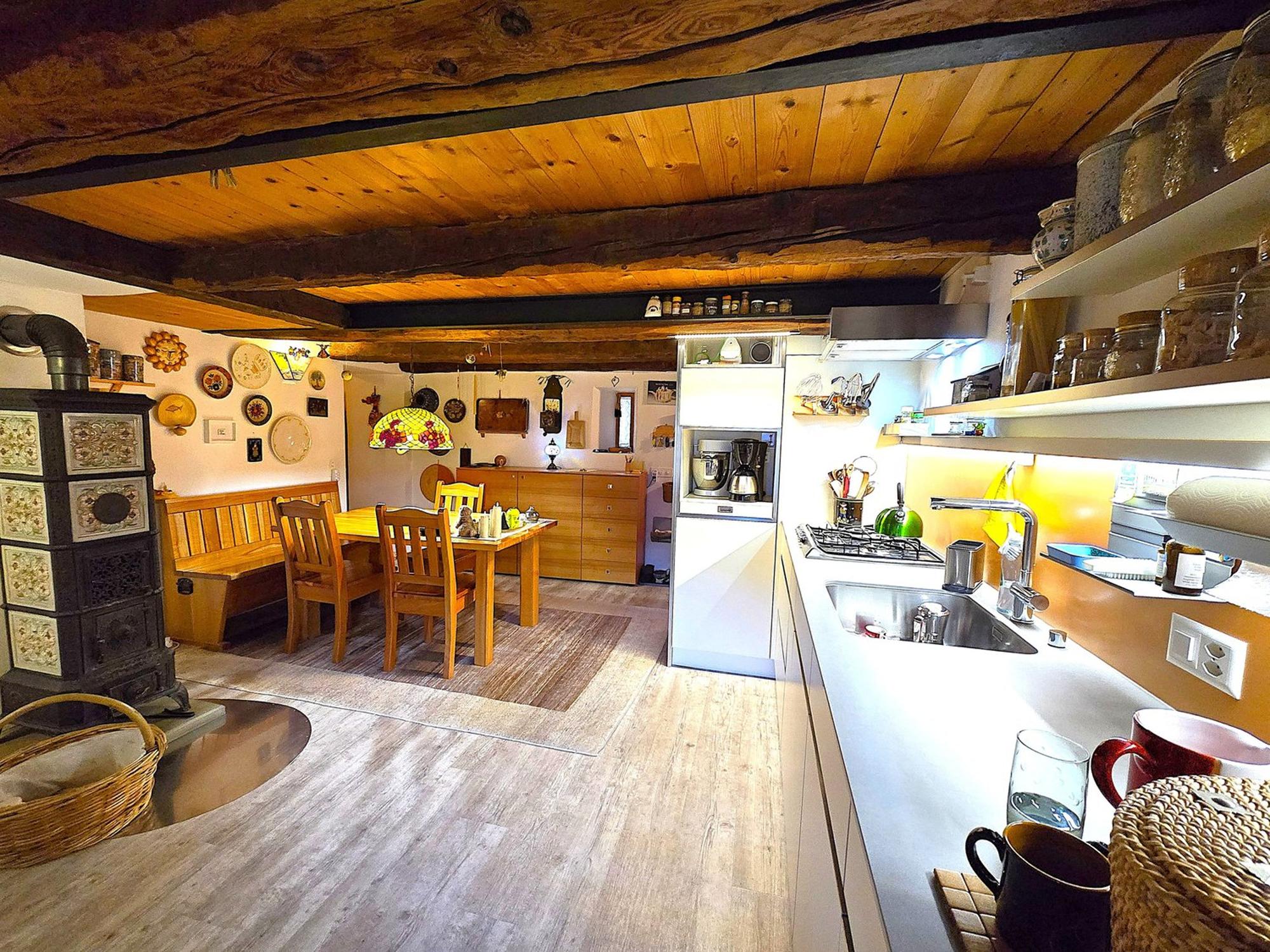 Al primo piano troviamo accogliente soggiorno con bella stufa in ceramica e accesso alla terrazza, camera da letto matrimoniale e bagno/doccia/WC.